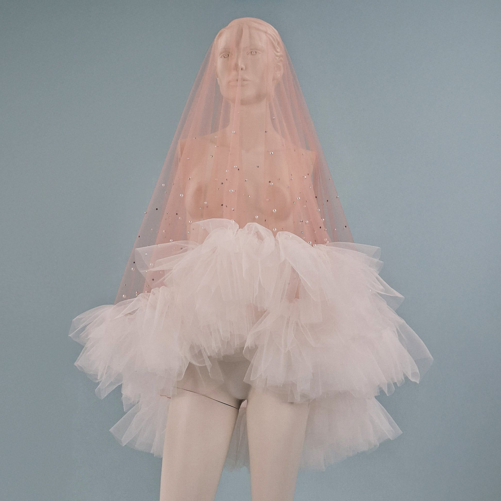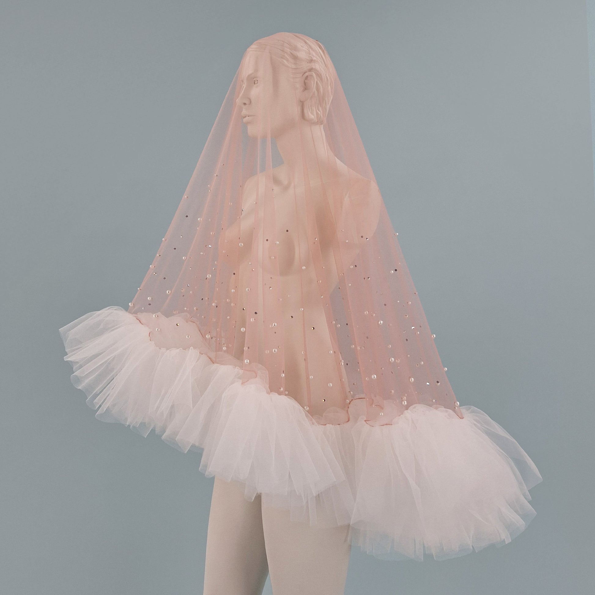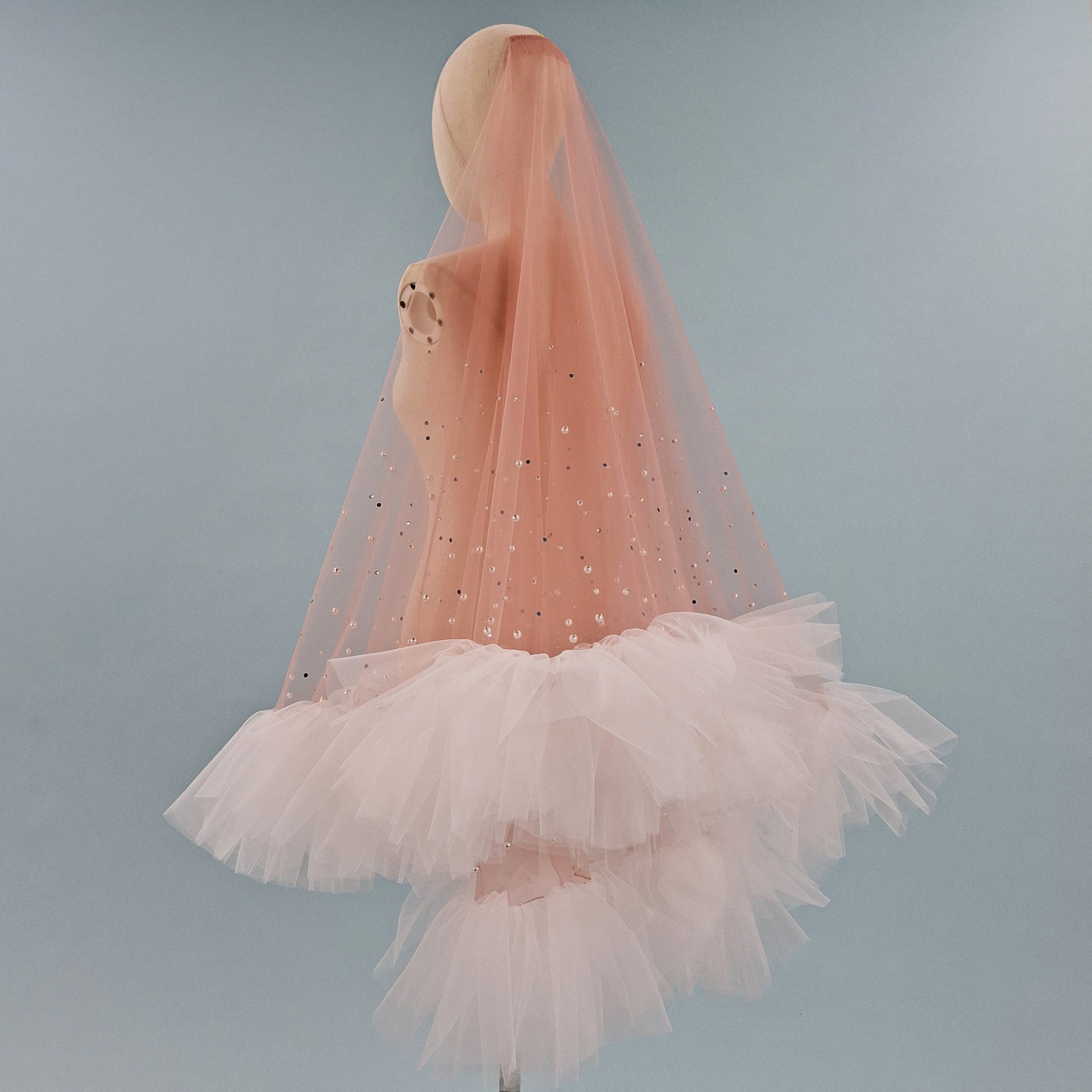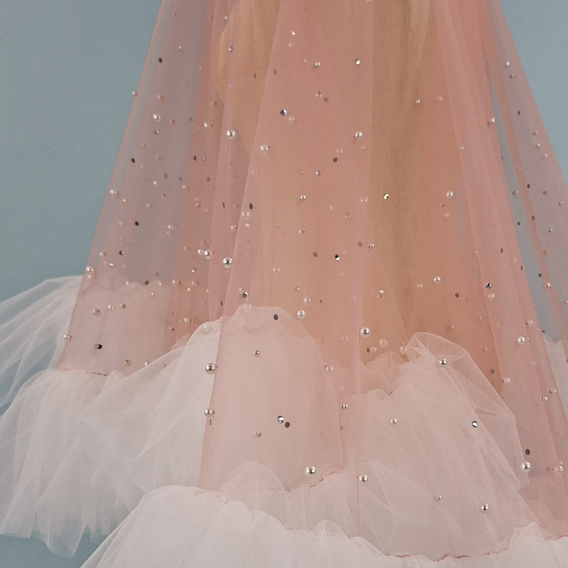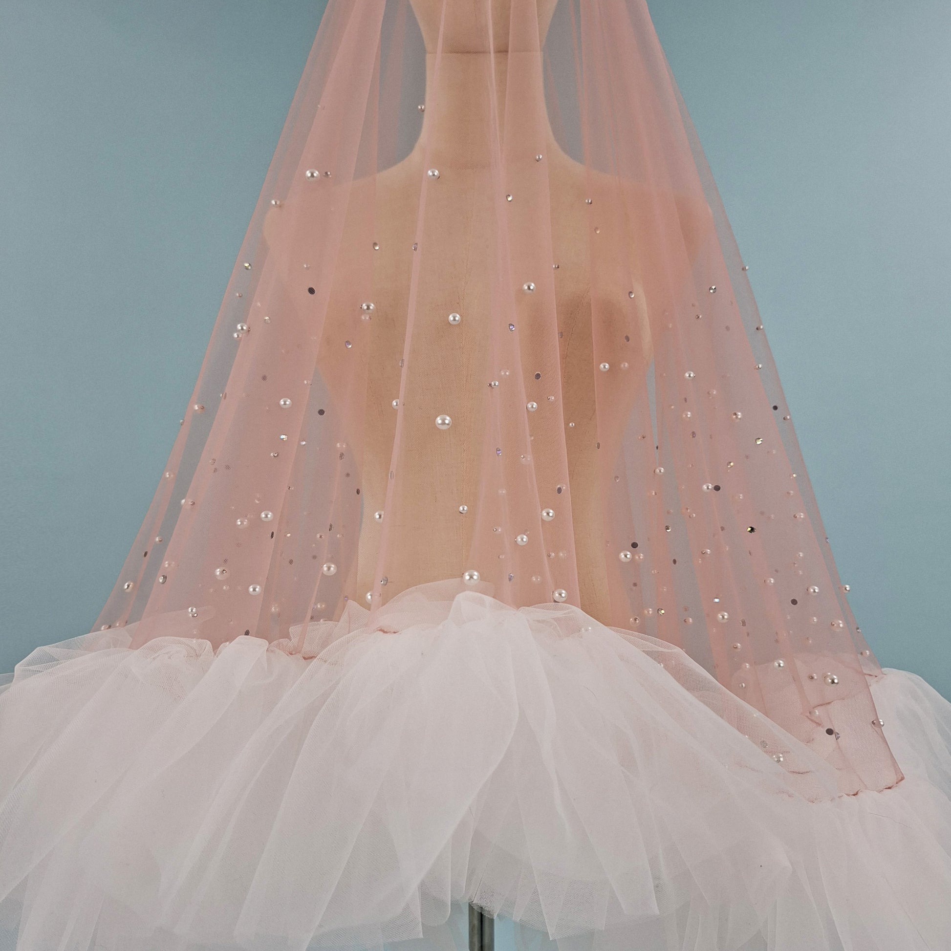 Veil is made from soft blush pink color tulle, that is pleasant to touch, is extremely lightweight and drapes beautifully. High quality imitation pearls are firmly fastened with metal rivets. Iridescent rhinestones are beautifully scattered around the ruffle edge.