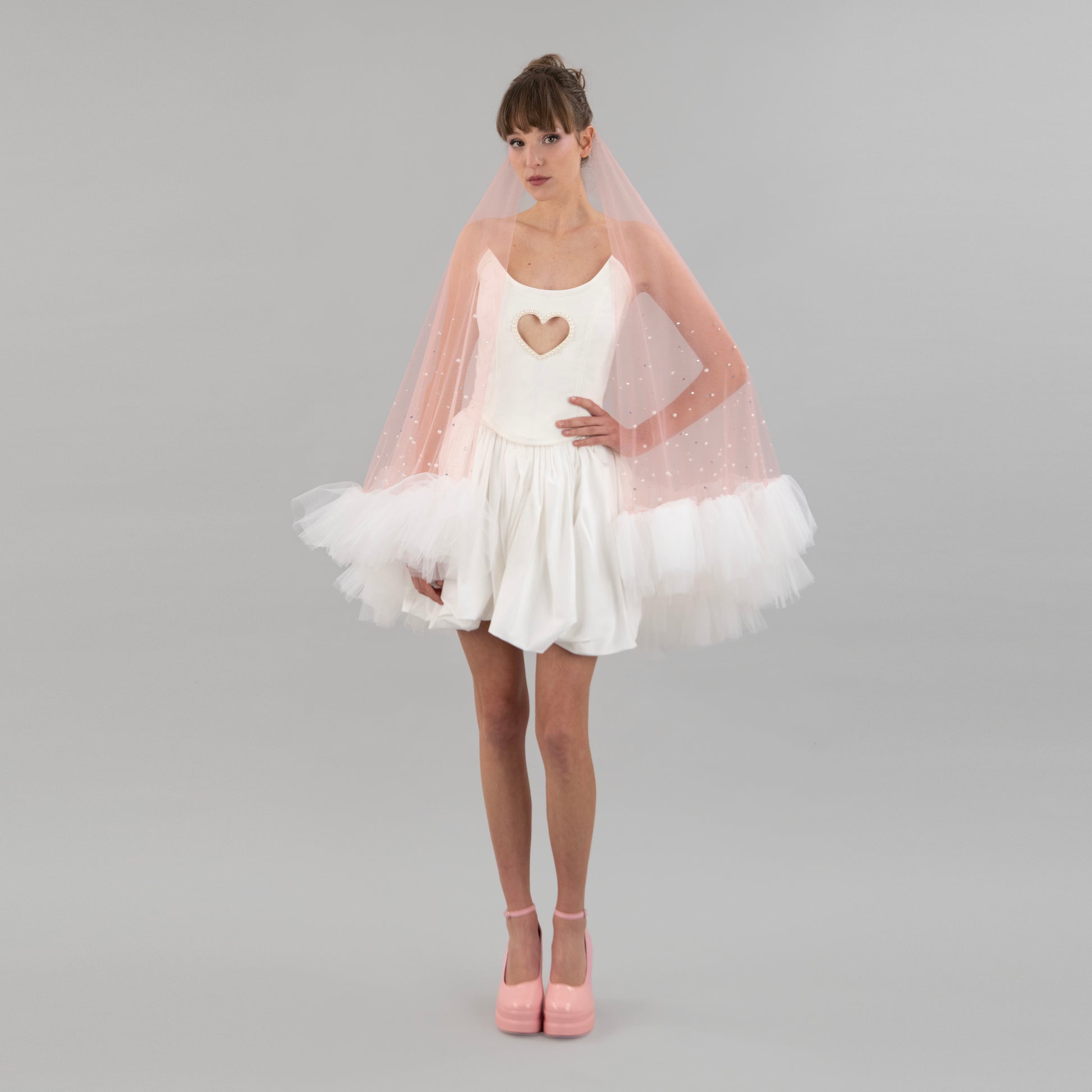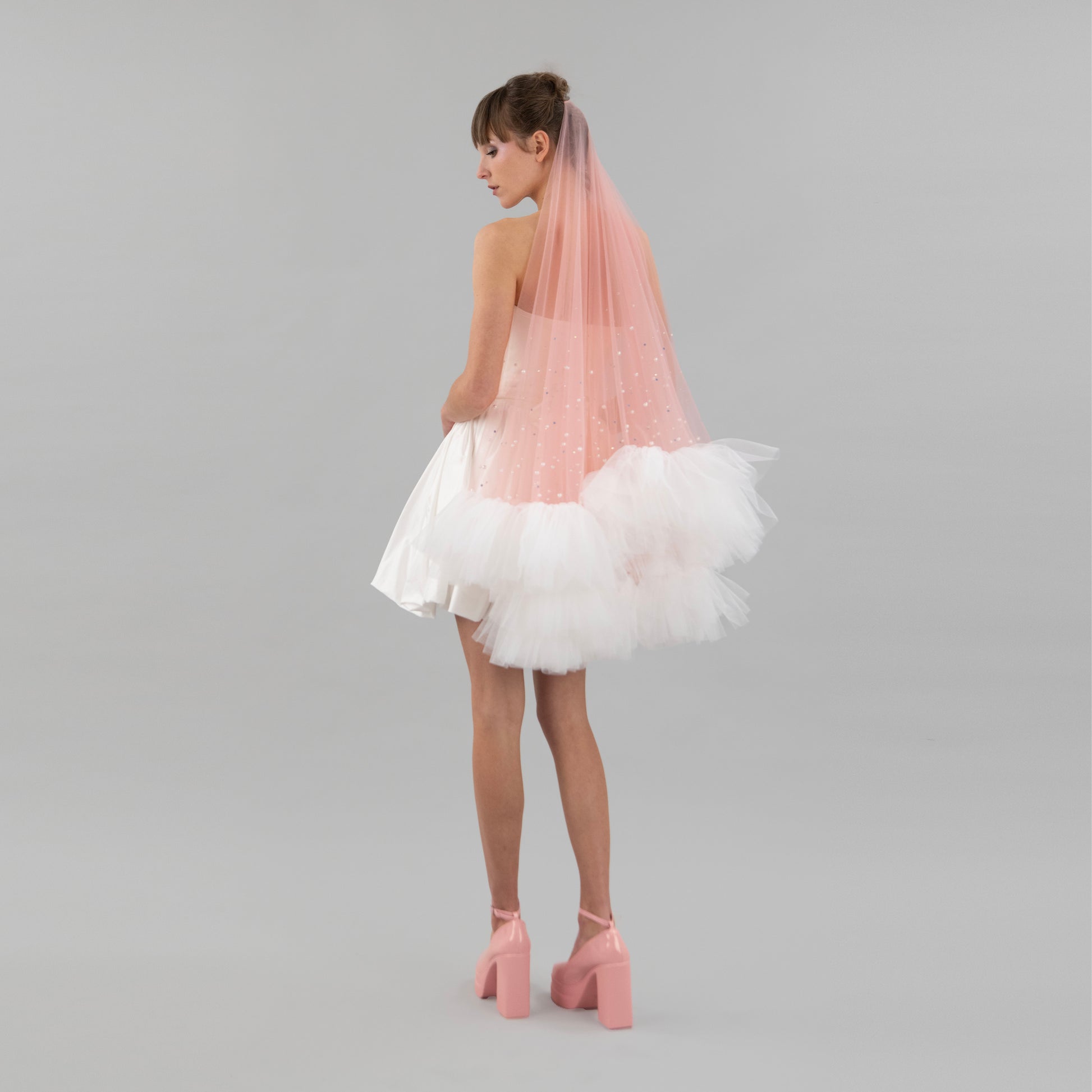 Blush pink and ivory ruffle veil is a sparkly statement piece for an alternative bride.