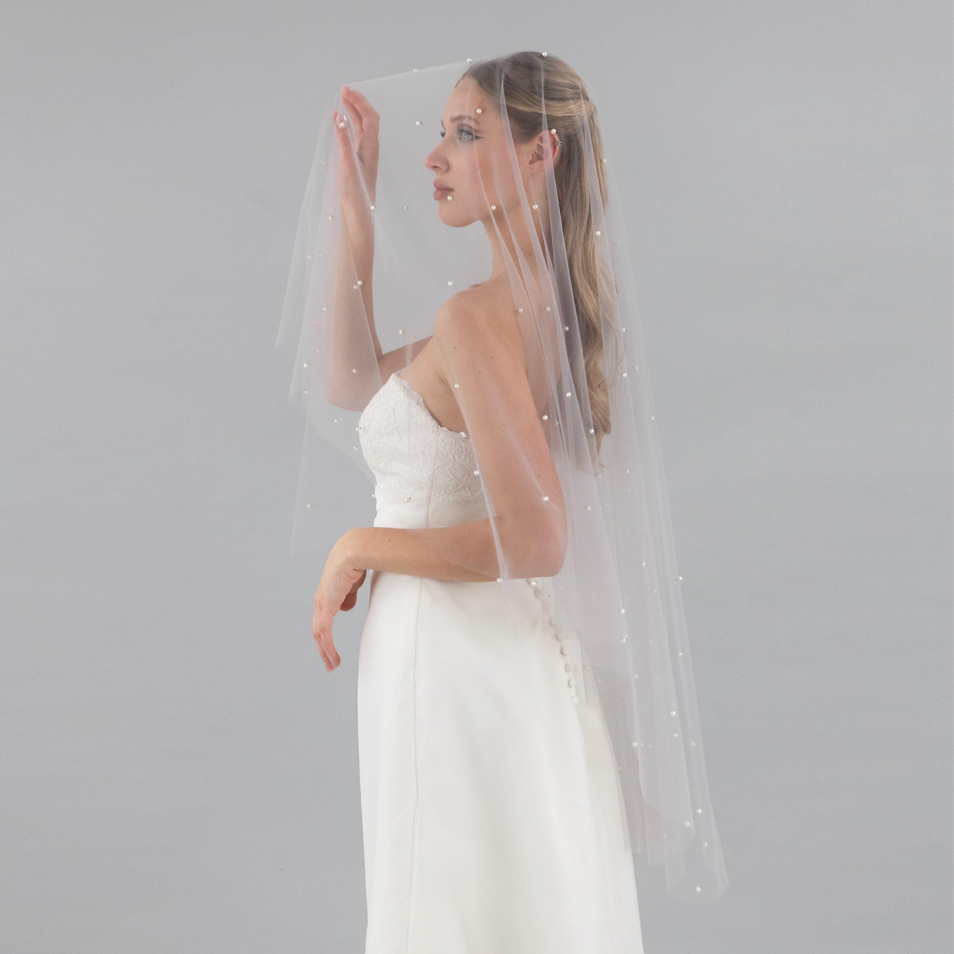 Stone gray pearl blusher veil is a perfect statement piece for a romantic bride.
